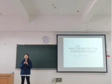 2021年12月3日星期五,20级宝玉石鉴定与加工专业市场贸易考察实习动员会在笃行楼314教室召开,到场主持的有珠宝玉石鉴定与加工的陈雨帆老师和孟龑老师,以及20级宝玉石鉴定与加工一班、二班的同学。