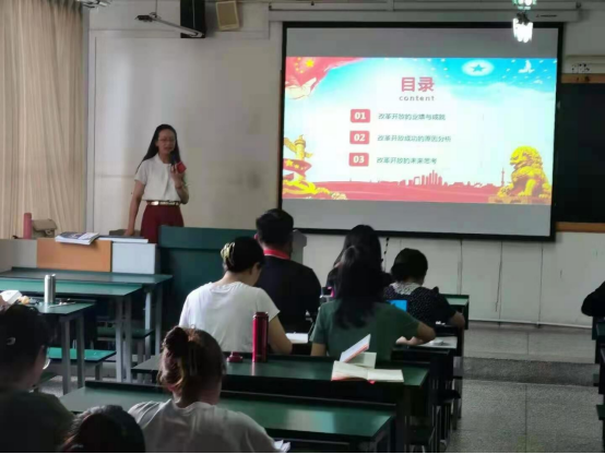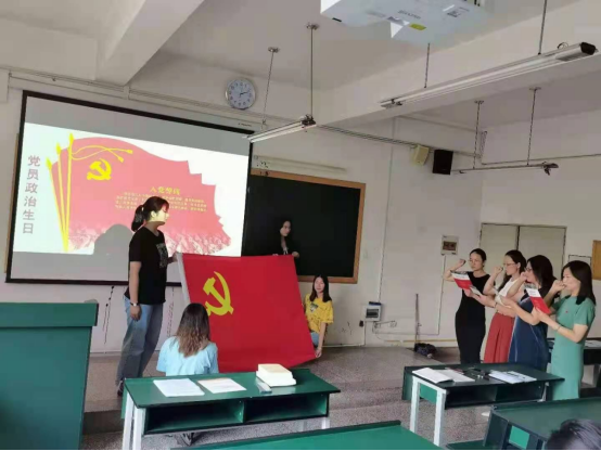 主题党日活动由刘迪老师主持,包括过政治生日,重温入党誓词、“党员跟着总书记学党史”读书会、优秀党员评选、“四史·大家讲”微讲堂四项主要内容。首先刘迪老师向过政治生日的老师赠送“政治生日”贺卡,带领党员教师面向党旗,重温入党誓词,接受心灵洗礼。随后进行“党员跟着总书记学党史”读书会分享,切实发挥好党员教师的模范带头作用。接着进行优秀党员评选,刘迪老师勉励全体党员教师要时刻牢记共产党员的政治责任和使命担当,以更加饱满的热情投身到工作岗位,以优异成绩迎接建党一百周年。最后杨鸿老师、白群芳老师、彭安继老师、杨勇老师从四史学习教育之改革开放史、知党史感党恩跟党走以优异成绩庆祝建党100周年、中国精神汇总等多方面给全体党员教师和部分入党积极分子、发展对象进行微党课讲解。