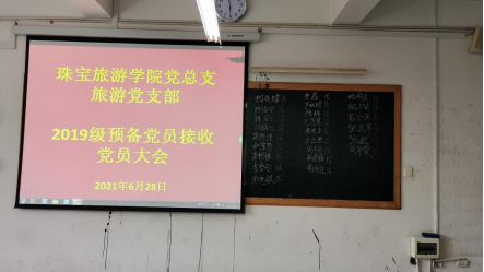 发展党员是党的建设一项经常性重要工作,是党的建设新的伟大工程的基础工程。为进一步做好2019级预备党员培养教育工作,提升发展党员质量,2021年6月28日下午,新葡官网党总支旅游党支部2019级预备党员接收党员大会在经开校区实验楼205召开。大会由旅游党支部书记陈畅老师主持,支部党员教师及学院新接收的24名党员发展对象参加此次大会。