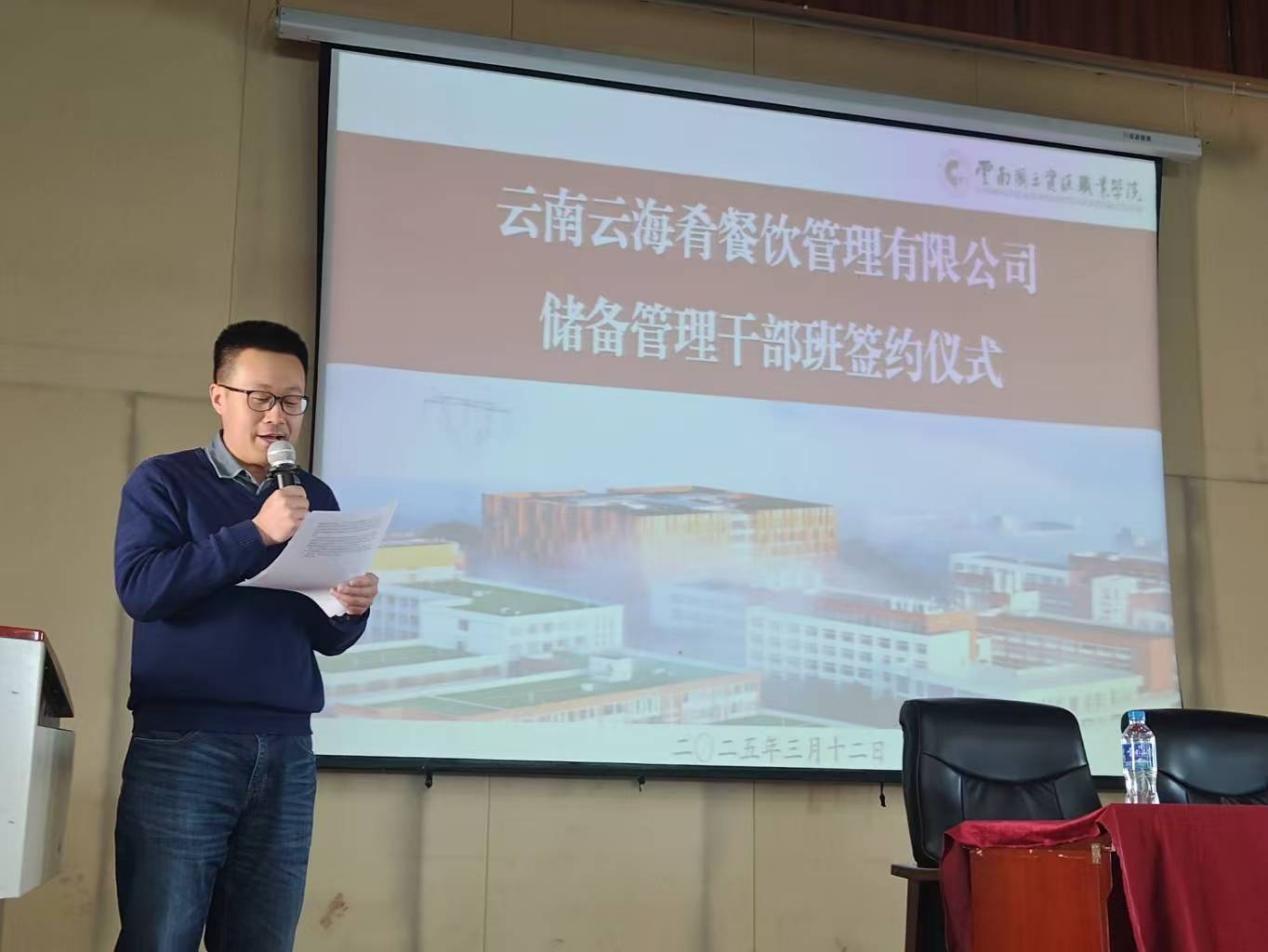 副院长孟龑致辞,他表示,此次合作是学院推进产教融合、深化人才培养模式改革的重要举措。通过与云海肴这样的知名企业合作,能够让学生在理论学习的基础上,深入了解行业实际需求,提升实践能力和职业素养,实现人才培养与企业需求的无缝对接。