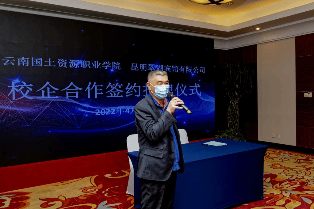 仪式上,昆明翠湖宾馆有限公司党支部书记刘勇先生首先致欢迎词并表示,企业和学校合作可以优势互补、资源共享,培养出真正适应市场和社会需求的人才。他希望双方精诚合作,以达到相互促进,共同发展的目标。