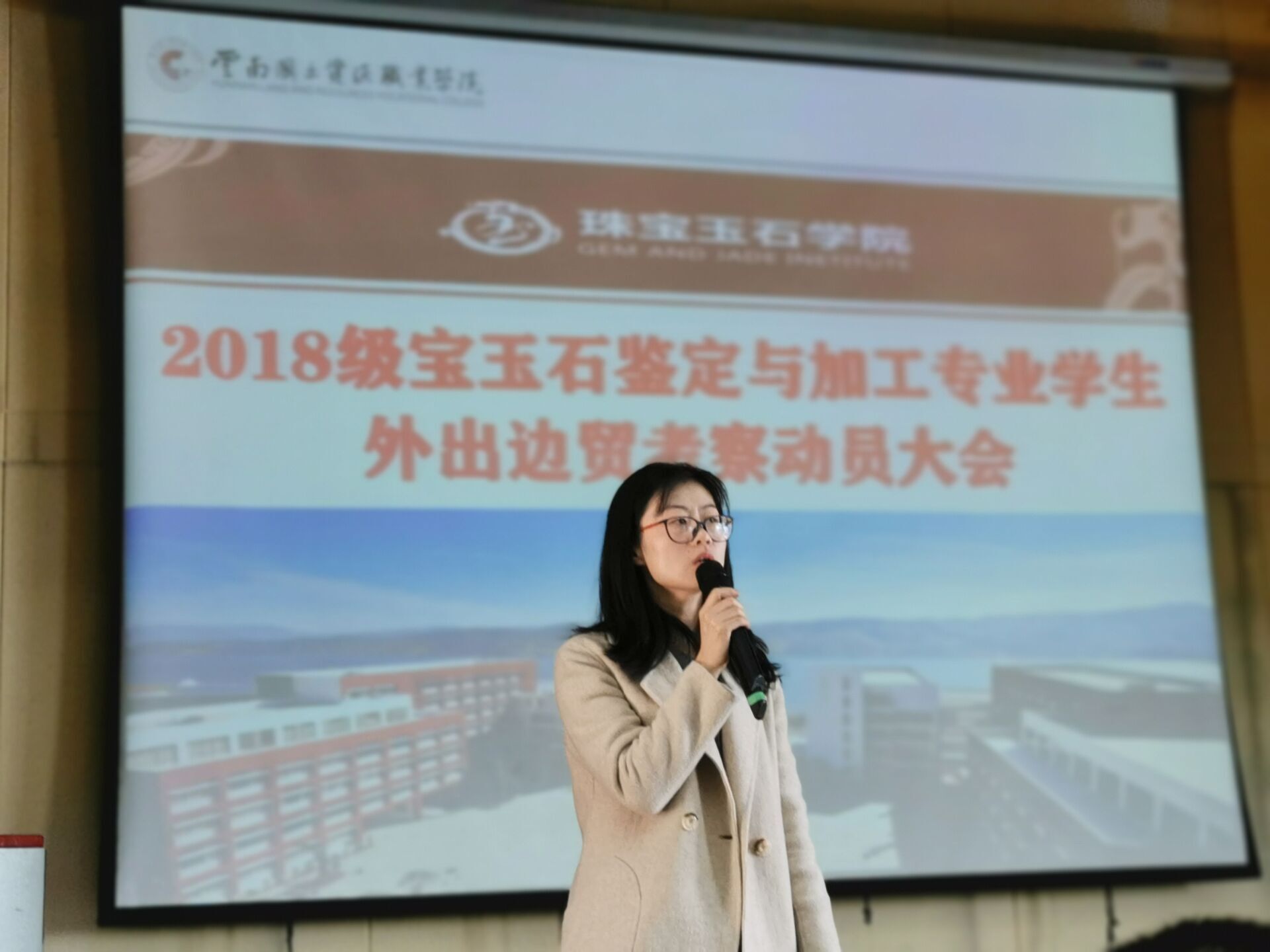 2019年11月26日中午,珠宝玉石学院宝玉石鉴定与加工专业学生外出边贸考察实习动员大会在光荣讲堂如期举行。出席本次实习动员大会的有此次实训考察带队教师代表李根云老师、陈雨帆老师、胡睿老师、汪朝飞副院长以及18级宝玉石鉴定与加工专业的全体同学。此次活动由李根云老师主持。