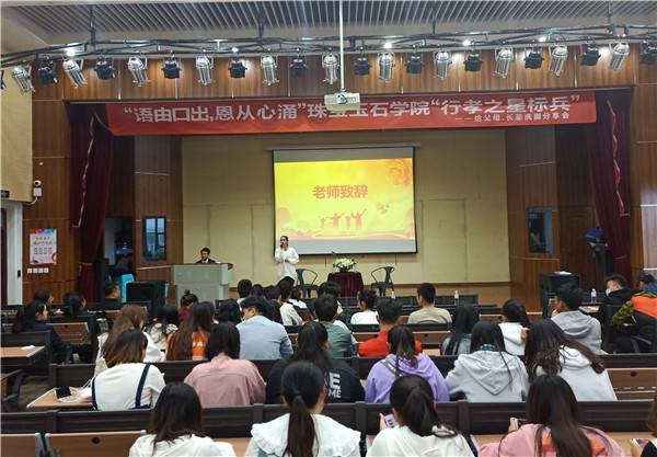 为进一步加强和深化大学生思想政治教育,弘扬传承中华传统美德,培育践行社会主义核心价值观,响应学校“1958”教育实践活动要求,珠宝玉石学院于2019年3月28日在光荣讲堂举行“行孝之星标兵”之“给父母长辈洗一次脚”感恩分享会。出席本次活动的嘉宾为:旅游休闲管理学院团总支书记李璐婕老师、测绘学院团总支书记合露露老师、资堪学院杨砚喆老师。珠宝玉石学院团总支书记沙双粉老师、各班学生代表参加了本次分享会。