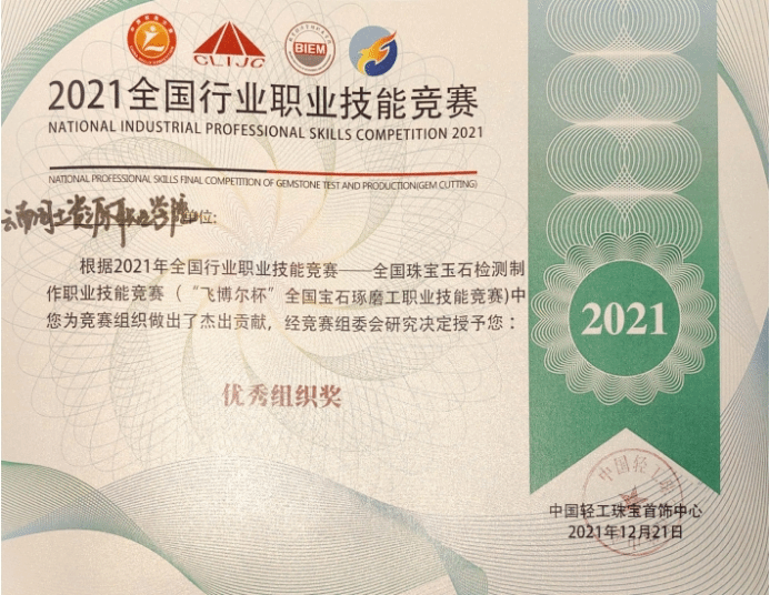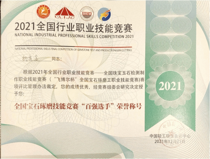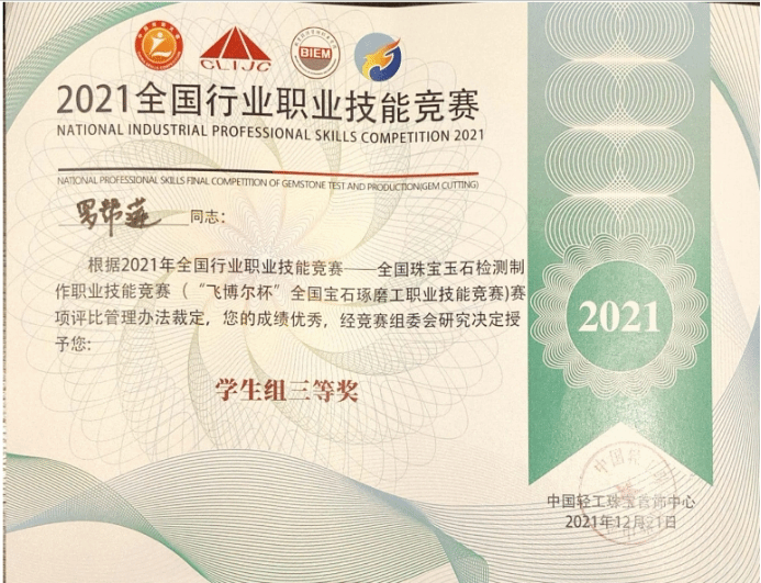 新葡官网的罗帮莲同学获得学生组三等奖和全国宝石琢磨技能竞赛“百强选手”称号,纳秀溪老师获得职工组铜奖与“全国轻工技术能手”称号、全国宝石琢磨技能竞赛“百强选手”称号;新葡8883官网AMG官网获得“优秀组织奖”。