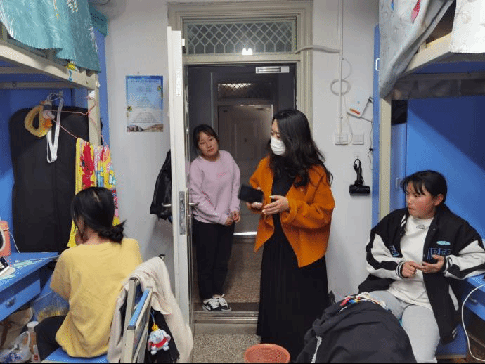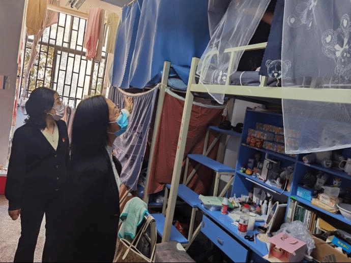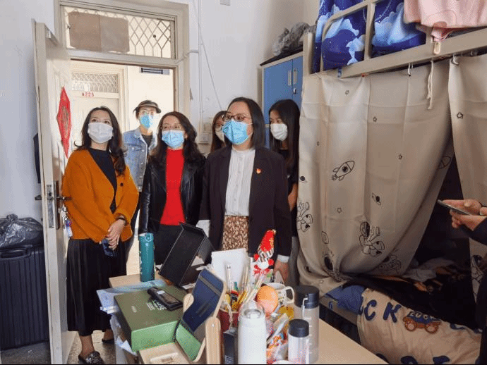 接着,张颖书记、陈畅院长和杨家娣副院长带领全体辅导员直奔学生宿舍、直插现场,深入一线检查疫情防控工作。他们走访各个宿舍,询问宿舍一日三检的情况,检查宿舍卫生及安全隐患,对学生进行疫情防控工作管理教育,要求学生做好疫情防控,坚决克服麻痹思想和松劲情绪,精准排查、严格管控,打好主动仗、争取好结果,确保疫情防控工作万无一失。