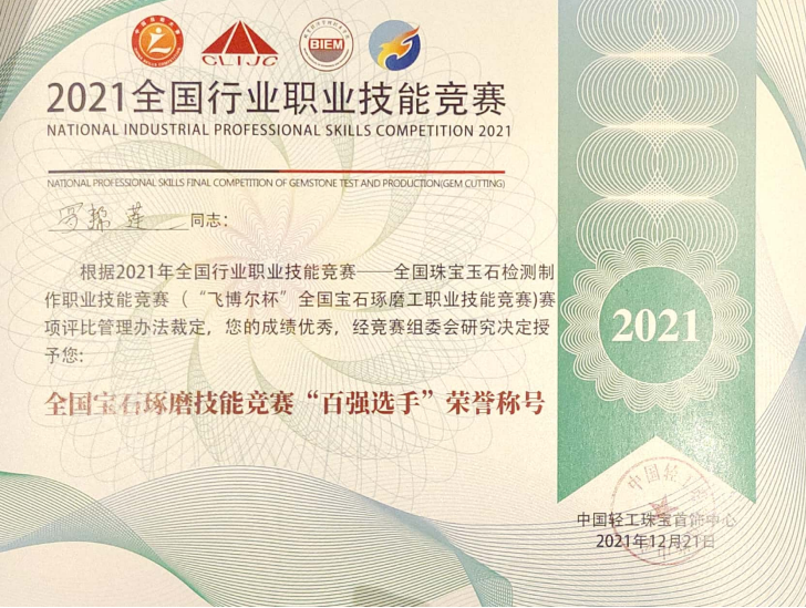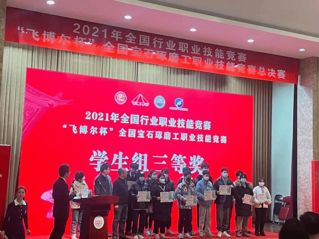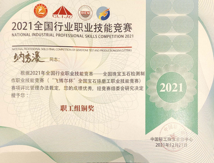 经过全国四个地区选拔赛脱颖而出的选手共计90名,来自全国各地26个省市的35个参赛队同台竞技,经过2天激烈地角逐,纳秀溪老师和罗帮莲顺利完成各项比赛。纳秀溪老师获得职工组铜奖与“全国轻工技术能手”称号、全国宝石琢磨技能竞赛“百强选手”称号。罗帮莲同学获得学生组三等奖和全国宝石琢磨技能竞赛“百强选手”称号;新葡8883官网AMG官网获得“优秀组织奖”。