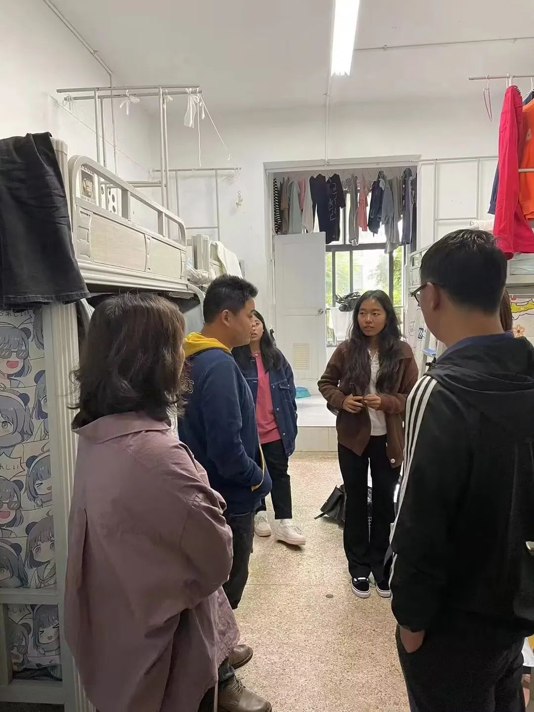 第二天一早,党总支副书记张军红带辅导员来到了新生女生宿舍,了解新生到校情况,就学习生活等与同学们进行了深入交流。最后向同学们强调要严格遵守校园疫情防控的相关规定,坚持在校期间的每日体温检测和健康打卡,严格按照学校防疫工作通知要求,配合学校做好相关防疫工作。