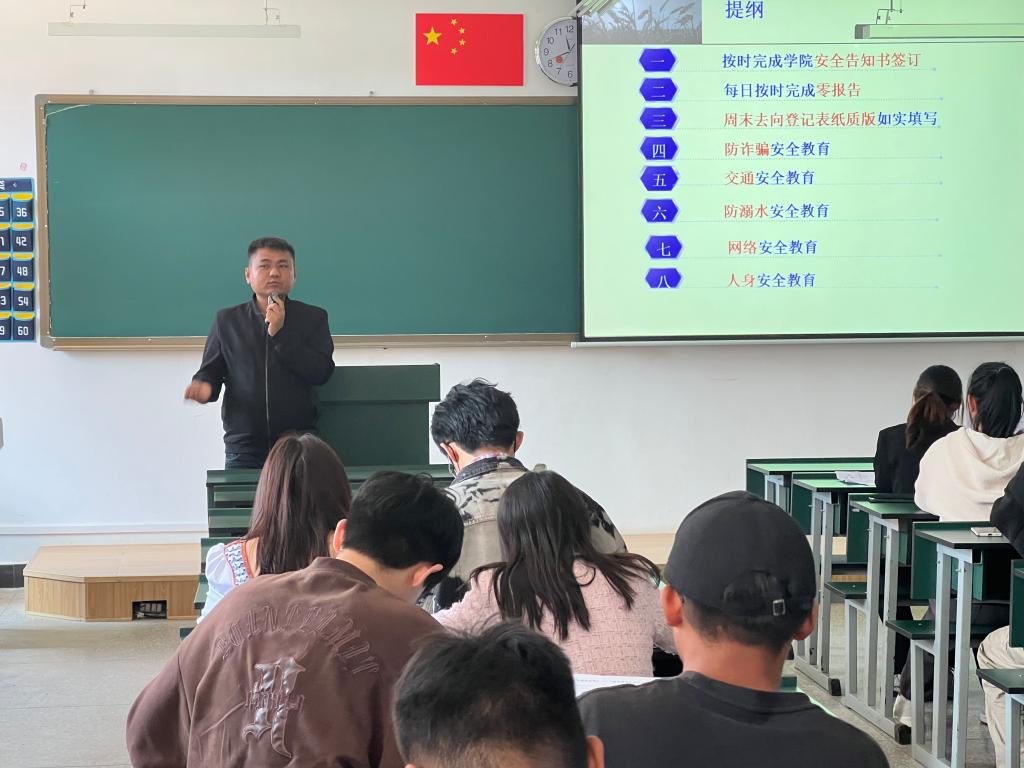 此次安全工作会由辅导员杨勇主持并发言,辅导员杨勇强调在周末外出时严格执行请销假制度,及时签离校登记表和宿管报备以做到数据同步,方便辅导员了解同学们去向,外出乘车不搭黑车,保护好自身人身及财产安全,外出游玩严禁私自下水游泳防溺水。其次,在校园生活中要注意预防网络诈骗、注意网络安全及宿舍安全问题,同时提醒各班班委要按时完成零报告,提高学院工作效率,及时将工作会所表达的内容传达,做到信息全覆盖,有任何问题及时向辅导员沟通反馈,最后希望各班班委对未来安全工作有一个明确目标和安排。