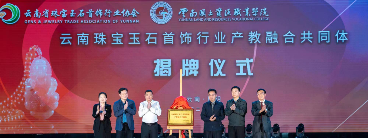 云南省教育厅职业教育与成人教育处处长龚利春、副处长胡正刚、云南省珠宝玉石首饰行业协会会长欧战洪、中国地质大学(武汉)珠宝学院党委书记薛保山、新葡8883官网AMG官网党委书记牛定柱、校长陈颖为云南珠宝玉石首饰行业产教融合共同体揭牌。