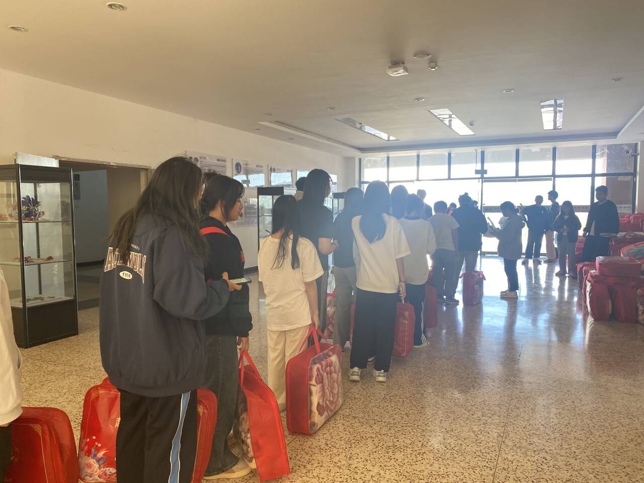 学院院长陈畅、党总支书记张颖以及党总支副书记张军红参与了这次发放活动。他们的问候和关怀,如同冬日的暖阳,温暖着每一个宝旅学子的心。陈畅院长的一句句问候,关切地询问着每一位同学的生活近况。张颖书记亲手将一份份物资递到同学们手中,传递着一份份真情和温暖。副书记张军红则带领学生会成员,组织同学们排队、核实个人信息、领取物资,使整个过程井然有序。