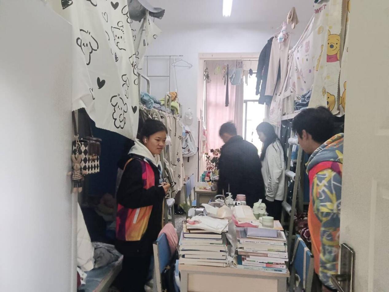 在走访过程中,吕明老师对同学们的校园生活、思想状态、宿舍安全等方面进行了细致交流。他强调了宿舍安全的重要性,并提醒同学们要时刻关注宿舍安全问题。此次安全检查工作的主要目的是排查隐患,保证同学们的住宿安全。经过检查,绘水苑一、二、三、四栋宿舍的卫生情况良好,窗明几净,洗漱台干净整洁,床铺上物品及其他生活用品摆放整齐,一切井然有序,欣欣向荣。然而,也有一些宿舍的卫生情况稍差,吕明老师对此提出了提醒和要求,并要求相关宿舍的同学要爱护宿舍卫生,为自身营造一个良好的宿舍环境。此次宿舍卫生检查的目的是让同学们注重和爱护宿舍卫生,弘扬新风尚,争做新青年。同时,这也是为了提高同学们的生活质量,营造一个更加舒适、安全的宿舍环境。