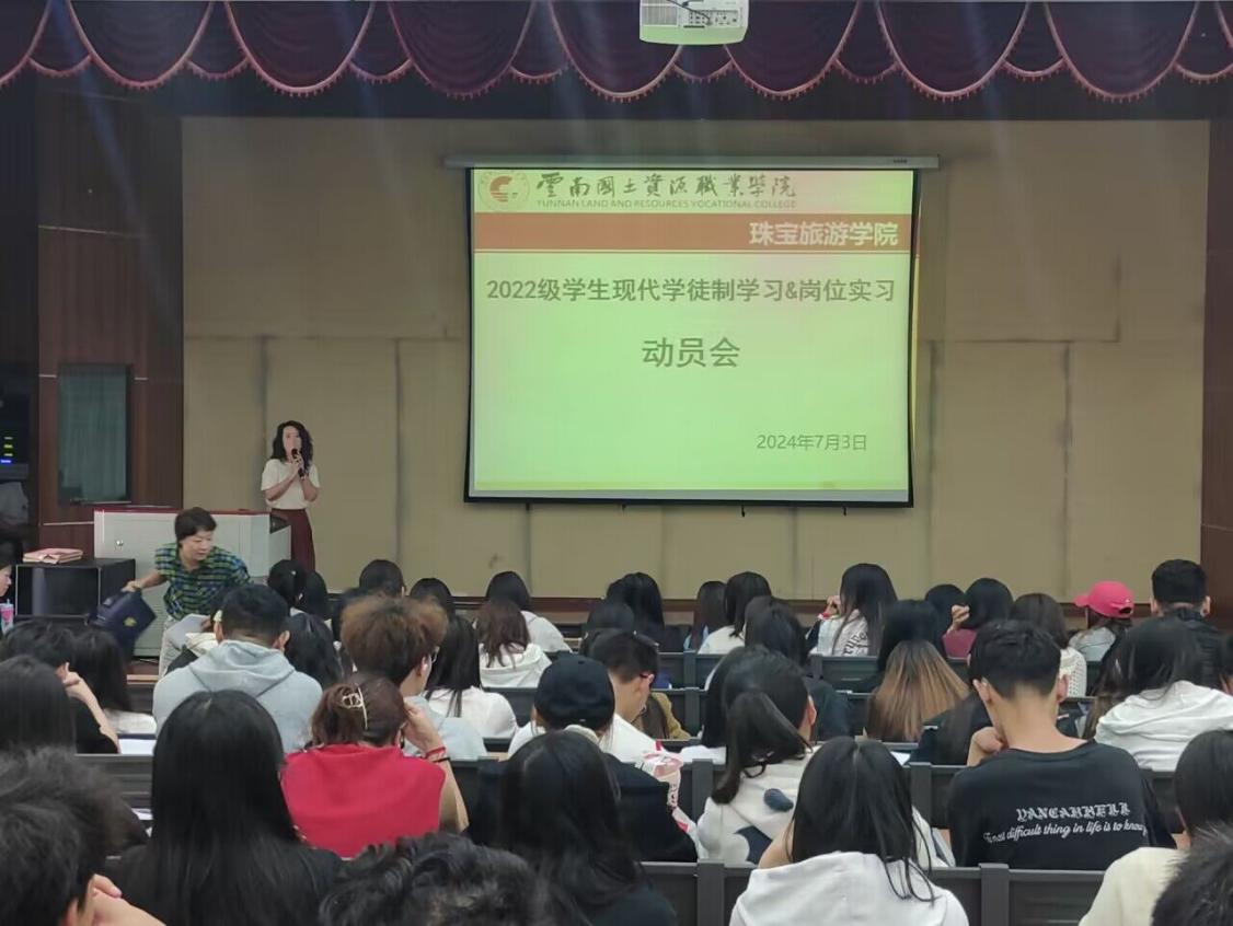 7 月 3 日,新葡8883官网AMG官网于光荣讲堂召开2022级学徒制学习及岗位实习动员会,宝玉石鉴定与加工专业群杨莉主持,新葡8883官网AMG官网院长陈畅、副院长杨家娣、党委书记张颖、党委副书记张军红、教务处夏俊伟、招生与就业处原菲菲,2022 级全体辅导员、班主任、学徒制学习、岗位实习指导教师及 2022 级全体学生参与。