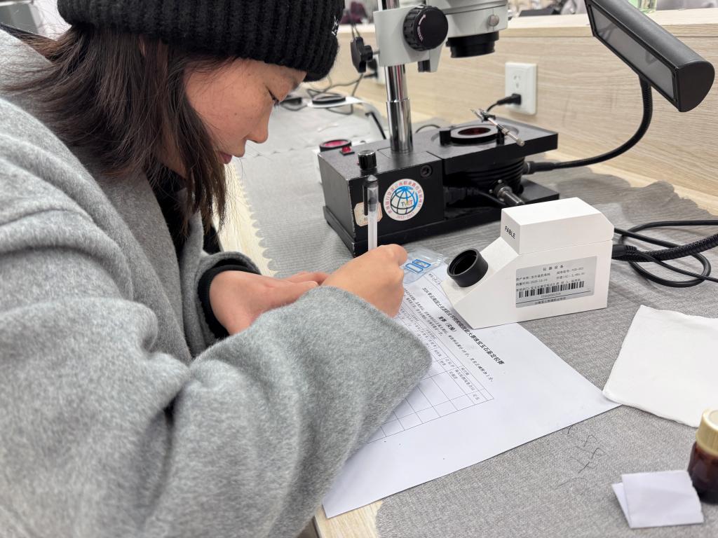 比赛开始前监考员公布大赛流程,让参赛选手依次前往取样处领取宝玉石标本,使用仪器鉴别每一件宝玉石标本并予以准确描述。参赛选手们个个全神贯注,他们先是通过肉眼仔细观察宝玉石的外观特征,接着运用专业的鉴定工具,有条不紊地进行检测分析,每一个步骤都尽显专业素养。