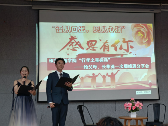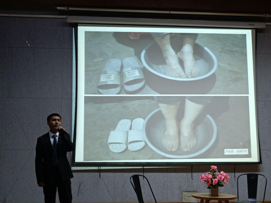 活动开始,首先由沙双粉老师介绍了举办此活动的历史和背景,然后由参赛的十位同学依次向大家分享了自己为父母、长辈洗脚过后的感受。活动主要以座谈的方式展开,参赛选手通过PPT展示、演讲等形式辅助进行,参赛者向大家分享了对此次活动的看法、自己想对父母说的话和自己以后想怎样回报父母,活动现场充满了感染力。
