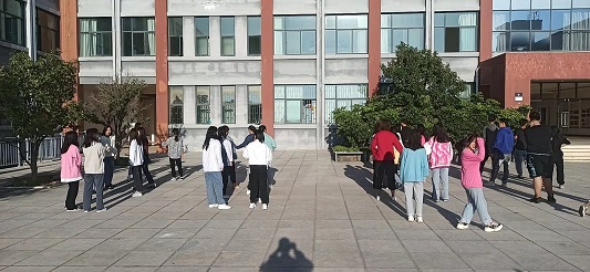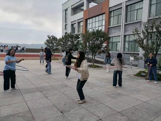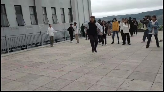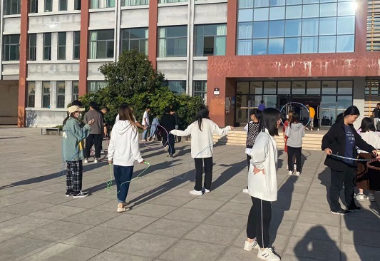 广场上,左手边的同学们从容优雅,神采飞扬。女生舞姿优美、落落大方,男生动作舒展、彬彬有礼,大家时转时舞,或起或伏,飘逸的舞步,旋转的身影,跳出属于我们的“华尔兹”。右手边的同学们脚尖一踮地,双腿抬起来,双手抡起跳绳,只听见跳绳打到地上“啪啪”直响。彩色跳绳从头上掠过,又从脚下一闪而过,好像一个光环。