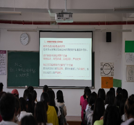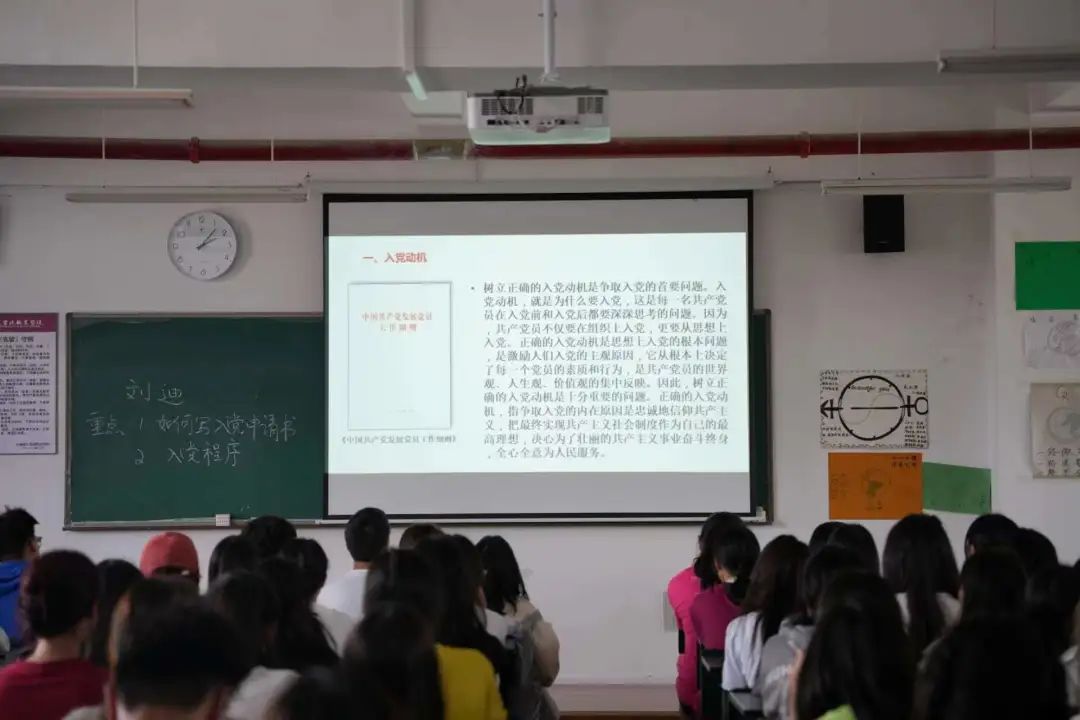 刘迪老师就党的性质、宗旨、基本原则等基本理论知识,及入党的相关程序、要求及发展党员工作细则作了详细的说明。要求同学们要端正入党动机、树立为国家和人民服务的宗旨,增强学习意识,努力成为同龄人中的榜样。