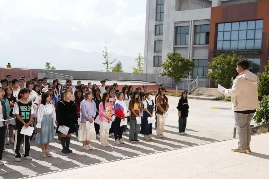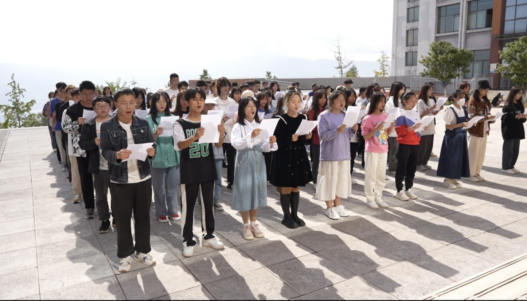 活动开始,全体人员站在洒满晨辉的国旗下,共唱中华人民共和国国歌——《义勇军进行曲》。