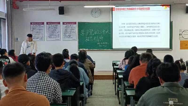 在幺晨彬同学的带领下,同学们回望了新时代十年的奋斗历程,并深入了解了习近平总书记在二十大报告中总结的十五个奋斗要点。习近平总书记在党的二十大报告中勉励广大青年要坚定不移听党话、跟党走,怀抱梦想又脚踏实地,敢想敢为又善作善成,立志做有理想、敢担当、能吃苦、肯奋斗的新时代好青年,让青春在全面建设社会主义现代化国家的火热实践中绽放绚丽之花。