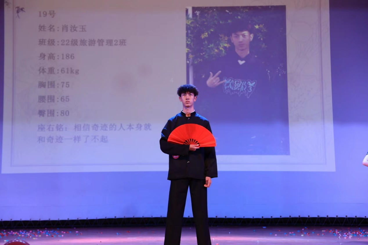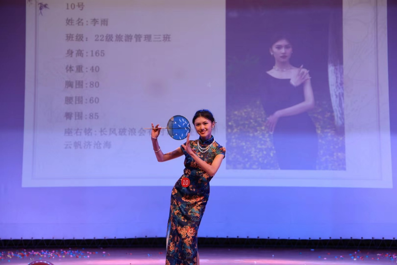 大赛主要分为旗袍、中山装、礼服、民族服饰四种类型,首先上台的选手们穿着一袭旗袍,曼妙多姿,笑颜如花款款向我们走来,完美地向我们演绎了什么是皎皎兮似轻云之蔽月,飘飘兮若回风之流雪。接下来,轮到身着中山装选手们的展示,成熟稳重的中山装结合了现代化改良尽显宝旅学子的坚毅自信、气宇非凡。第三轮比赛的主题是礼服,各式各样的礼服呈现在舞台上。模特们踩着闪亮的高跟鞋,华丽的裙摆随她们曼妙的身姿而摆动,实在是一场绝美的视觉盛宴。他们用自信的步伐,走出了青春的风采,无不浸透着模特们在舞台背后日日夜夜付出的辛勤汗水。最后展示的是民族服饰,各族文化融于一身服饰沉淀了千年文化的模样,却是惊艳了岁月。选手们穿着不同民族服饰,手拉着手,展现了各民族手足相亲,守望相助,一家亲的真挚情谊,我们像“石榴籽”一样紧紧地抱在党旗之下。