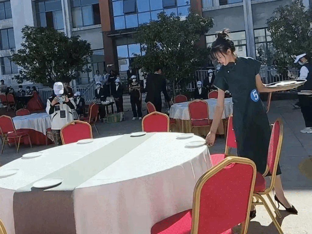 大赛第一项进行的是“宴会设计服务”技能展示,第二项进行的是“宴会对客服务”技能展示。比赛过程中选手们仪态端庄、身手敏捷、动作娴熟,较好地展现了宝旅学子饱满的热情、扎实的摆台技能和积极向上的态度。