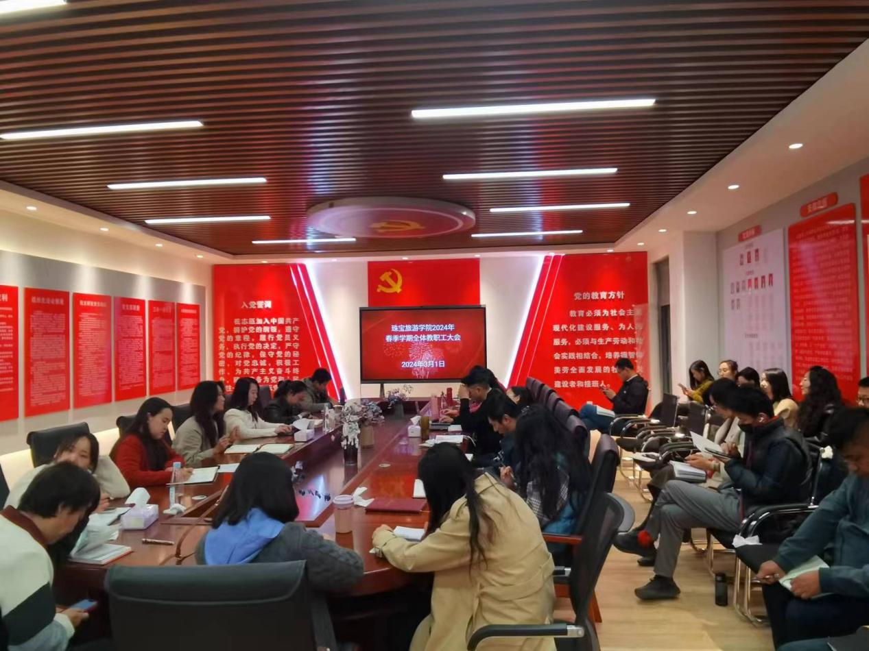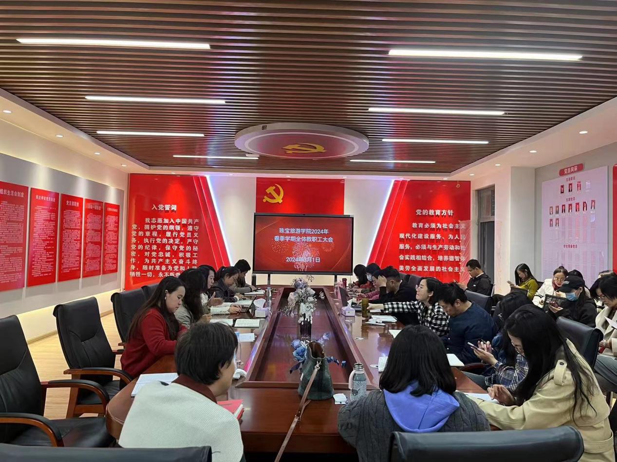 第二项议程,陈畅院长统筹安排了2024年春季学期学院相关工作,并指出各调研室及各专业积极开展走访和调研活动,收集了大量有价值的资料和数据。本次调研活动对后续人才培养方案的修订、校企之间合作、产教融合共同体建设等具有指导意义。初步形成的调研报告已汇总。开学后,老师们需做好人才培养方案的修订,推进校企合作典型生产项目,创新将旅游资源与珠宝结合,整合落实各块工作,并加强双高建设工作。第三项议程,张颖书记提出新一年工作的要求,内容包括:(一)坚持统领抓、抓统领、做到统揽全局、统一思想、统筹各方;(1)统揽全局,始终坚持党的全面领导贯穿学院发展全过程,各领域,持续推动党建与业务深度融合,不断把党的政治优势、组织优势转化为管理效能、发展效益,各支部充分发挥“党建融合”作用,提升学院党建品牌效应;(2)统一思想,一切工作都要从学校全年工作思路中找方向、找路径、找方法、找答案,切实把学校发展的目标转化为学院高效运行的强大动力;(3)统筹各方,党建教学,学生、实习实训、管理等目标同向,责任同担,行动同步,想在一起,站在一起,干在一起,做到横向到边、纵向到底,闭环管理;(二)坚持系统抓、抓系统,增强战略性、强化协同性、提高敏锐性;(1)增强战略性,学院发展关乎每一位师生,我们要树立战略思维,想问题、办事情、作决策要胸怀“学院之大者”“学院之重者”“学院之要者”既为学院争光、又为学校添彩,让品质宝旅更出彩;(2)强化协调性,坚持统筹兼顾,善于算整体账、算综合账,善于把握关键点,把握时度效,善于抓重点出亮点、抓难题求突破,统筹推动各项工作上水平、上台阶;(3)提高敏锐性,做到见微知著,眼睛亮、见事早、行动快、决不能“捡了芝麻丢了西瓜”,坚决守住守牢底线思维;(三)坚持具体抓、抓具体,瞄准具体问题,找准具体举措,落位具体责任;(1)瞄准具体问题,坚持问题导向到学生生活中去、到课堂学习中去、到社会企业需要中去,瞄准发展难点“学生痛点”“落实堵点”在解决问题中提升服务水平,在师生满意中推动学院发展;(2)找准具体举措,坚持效果导向,把各项工作细化、深化、具体化,把任务变成方案,把方案变成清单,把清单变成成绩单,真正用结果说话、用数据说话、用事实说话。(3)落准具体责任,坚持责任导向,把任务分解到岗位、落实到人,人人身上有任务、个个肩上有担子,确保各项工作落实细小,落地生根。
