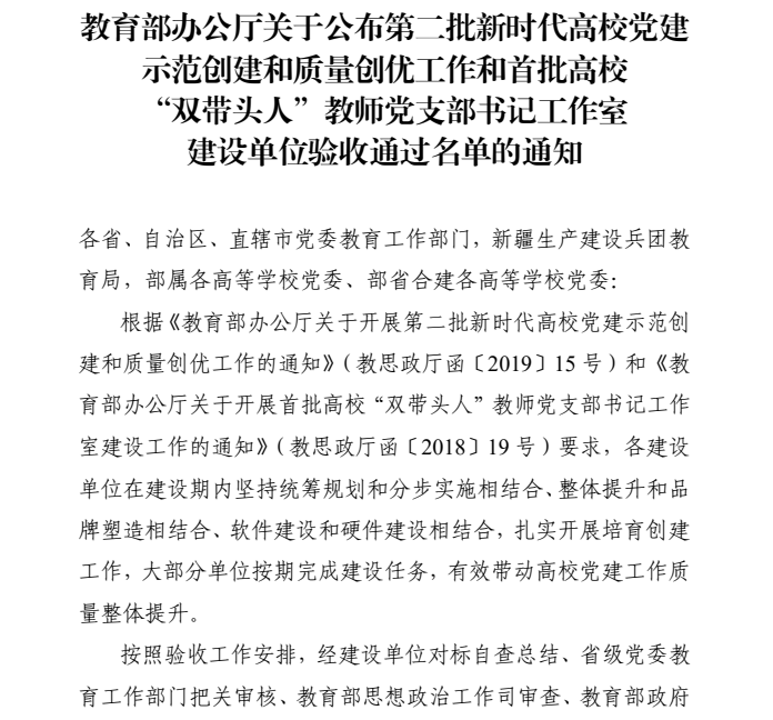 教育部思想政治工作司近日公布了第二批全国党建工作示范高校、标杆院系、样板支部等培育创建单位通过验收的通知,经建设单位对标自查总结、省级党委教育工作部门把关审核、教育部思想政治工作司审查,新葡8883官网AMG官网宝石党支部顺利通过第二批“全国党建工作样板支部”培育创建单位验收。