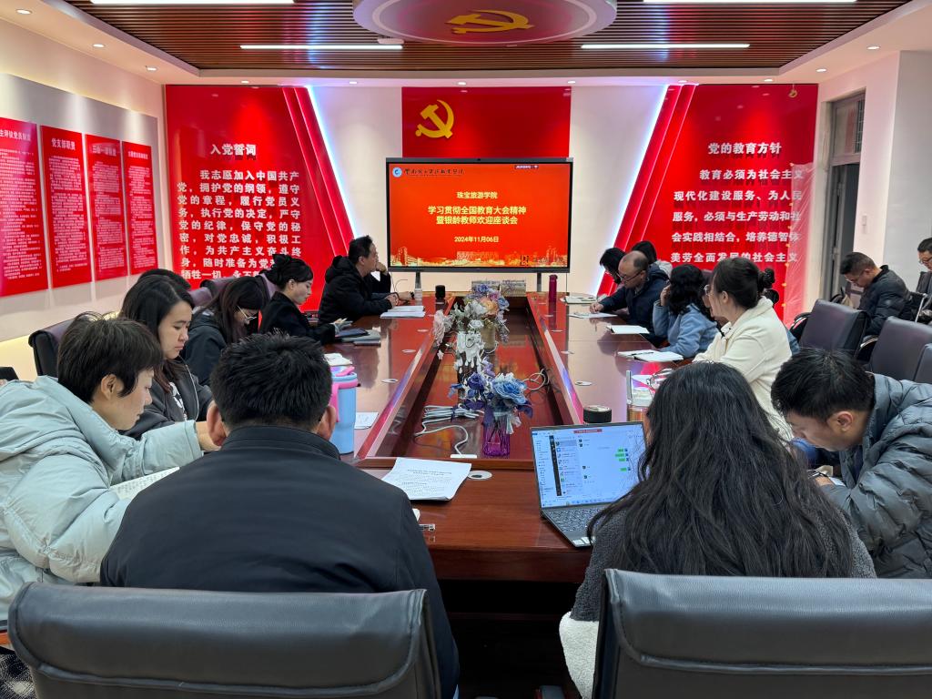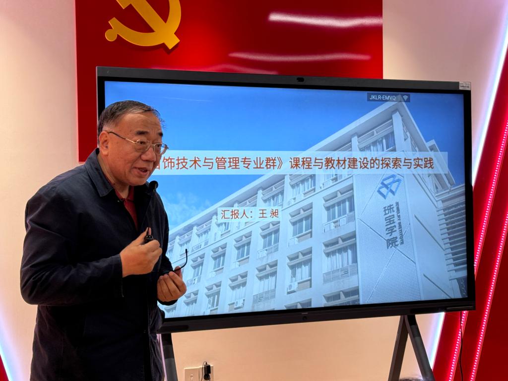 学院党委书记袁佳主持会议并讲话。学院银龄教师,广州番禺职业技术学院原珠宝学院院长王昶教授作题为《珠宝首饰技术与管理专业群课程与教材建设的探索与实践》专题辅导。
