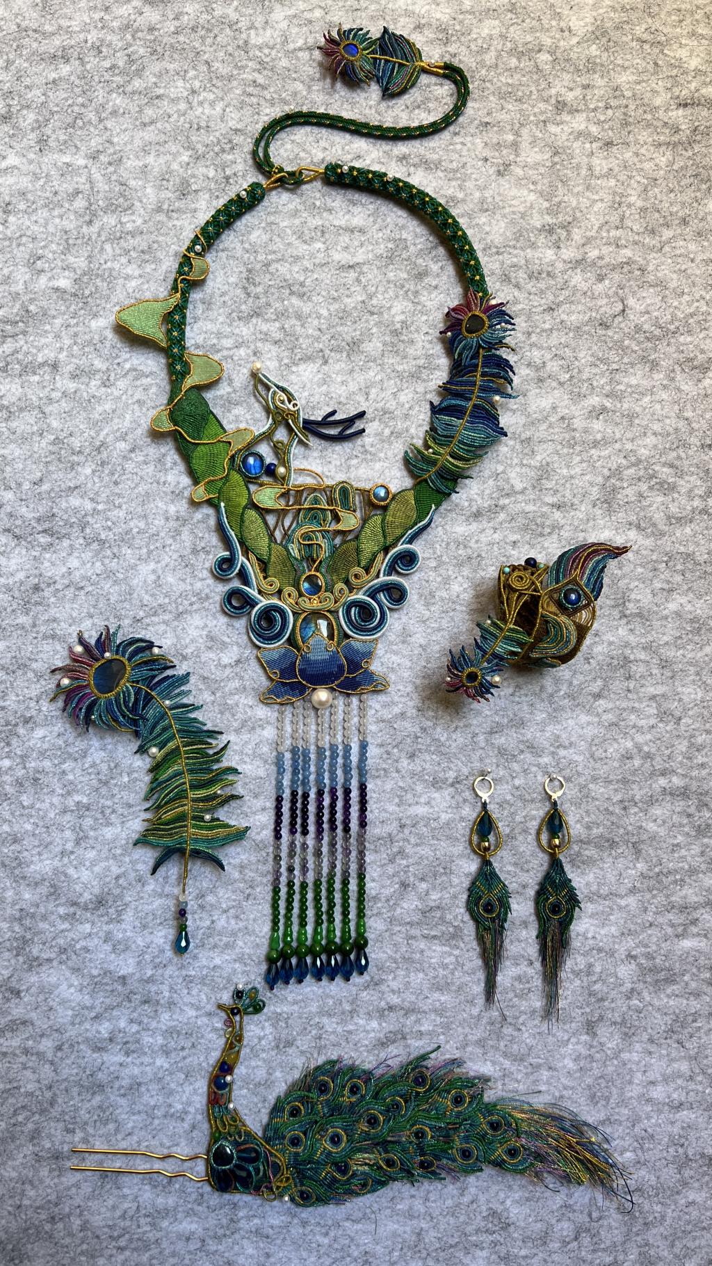 作品选用蜡线,采用绳艺首饰编织综合技法,以绳编和宝石镶嵌的方式,编织了一套集项链、耳环、发簪、手链、胸针为一体的首饰作品。通过她的巧思设计和精湛的编织技术,将云南的独特之美展现得淋漓尽致。一套栩栩如生的孔雀展翅造型表达了创作者吉祥如意、福瑞降临的美好祝愿。正如大赛评委中国非物质文化遗产研究网总编辑孟庆功所言:“非遗文化的价值不仅在于它的历史厚度,更在于它在当代语境中的活态传承。”通过选手们的精湛技艺,让传统与现代相碰撞,使传统元素在新时代焕发了新的活力。